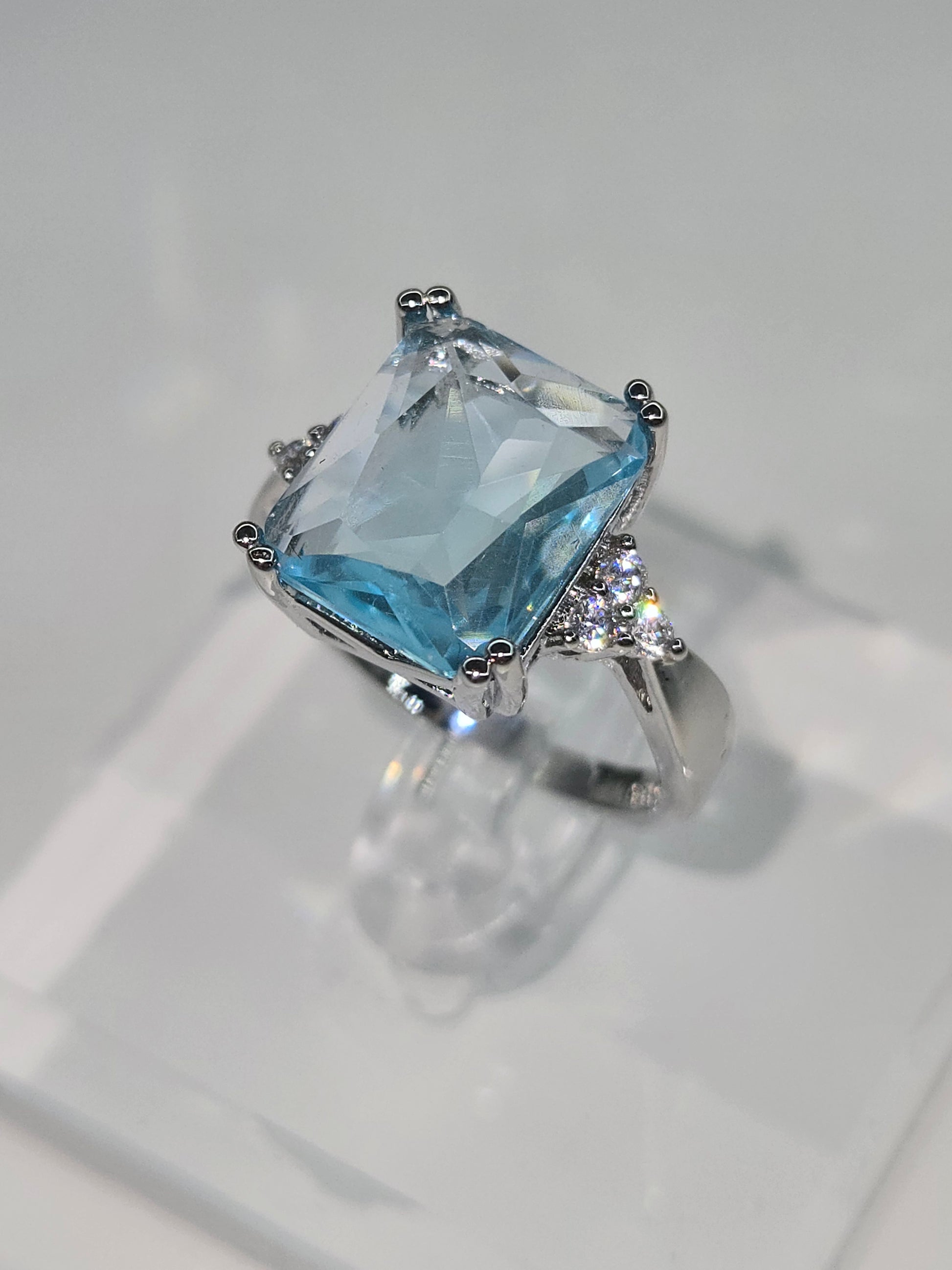 This sophisticated Aquamarine Ring showcases a 5-carat lab-grown emerald cut aquamarine set in sterling silver, accented by shimmering zirconia side stones. Its sleek design enhances the gemstone’s cool blue brilliance, offering a refined and timeless accessory for elegant occasions.