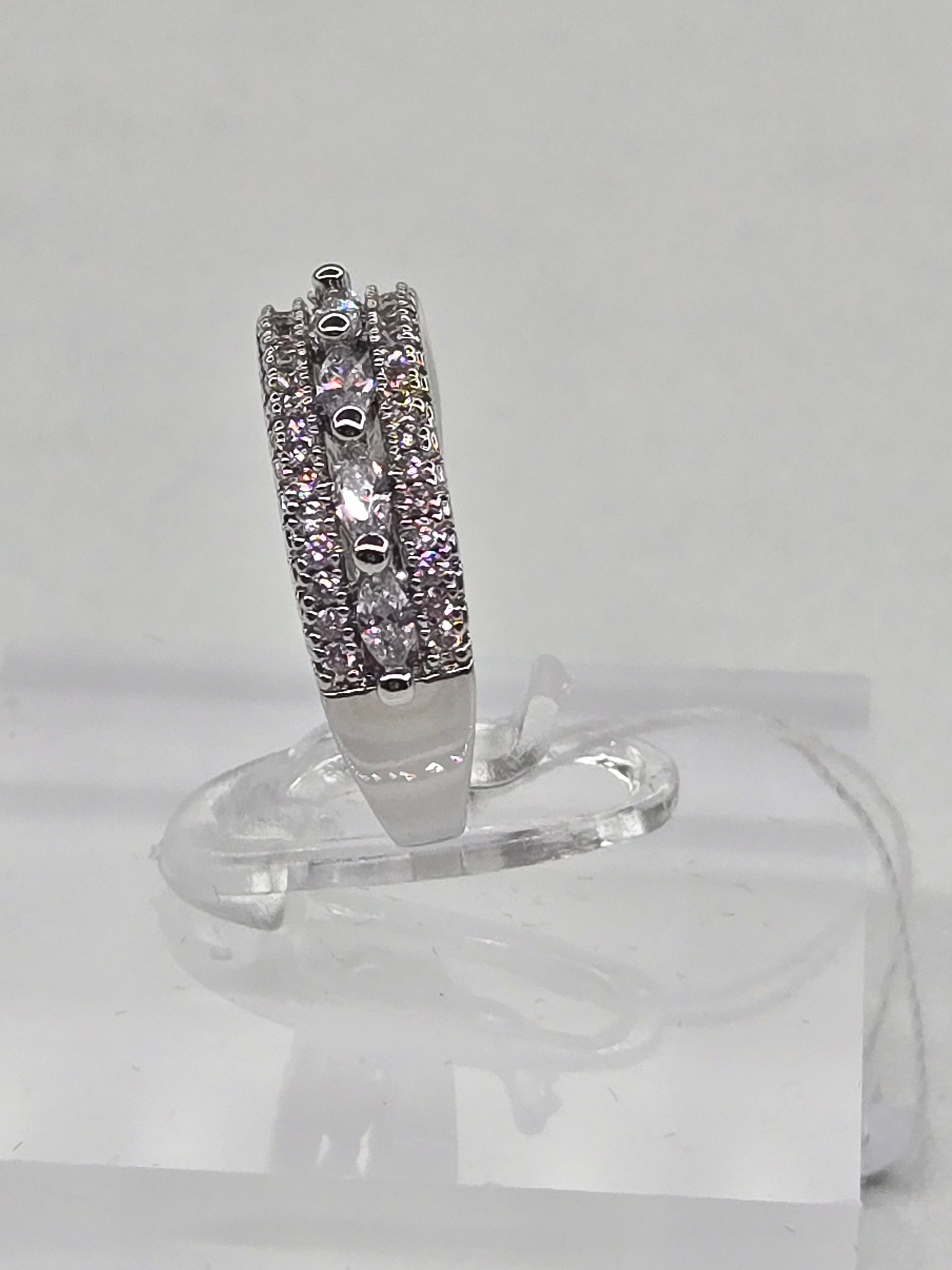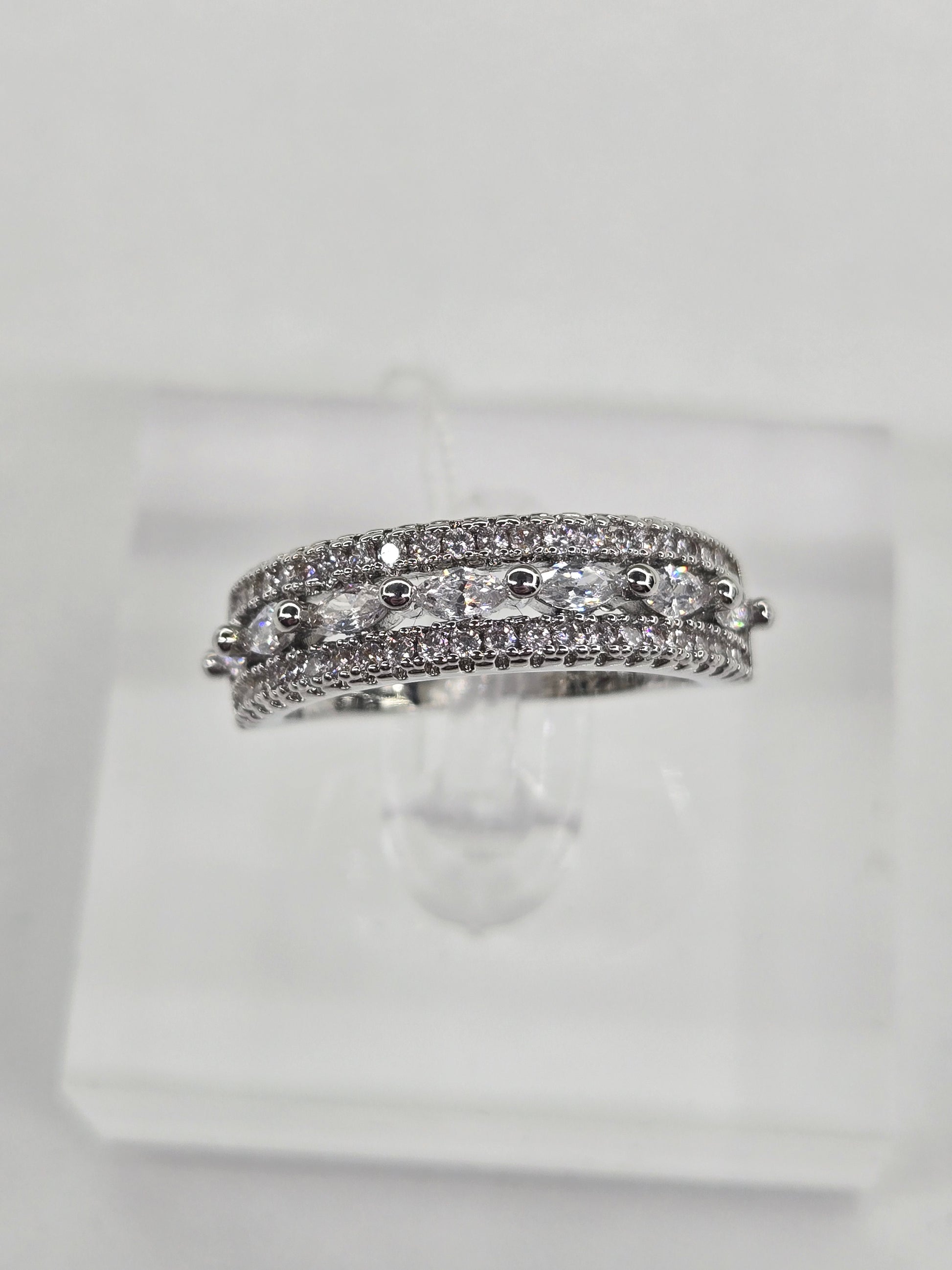 This sterling silver Half Eternity Cocktail Band features a vintage-style band adorned with three rows of sparkling zirconia stones in a half-eternity design. The larger stones inlaid along the band add a touch of elegance and timeless sophistication, making it a perfect statement piece for special occasions.