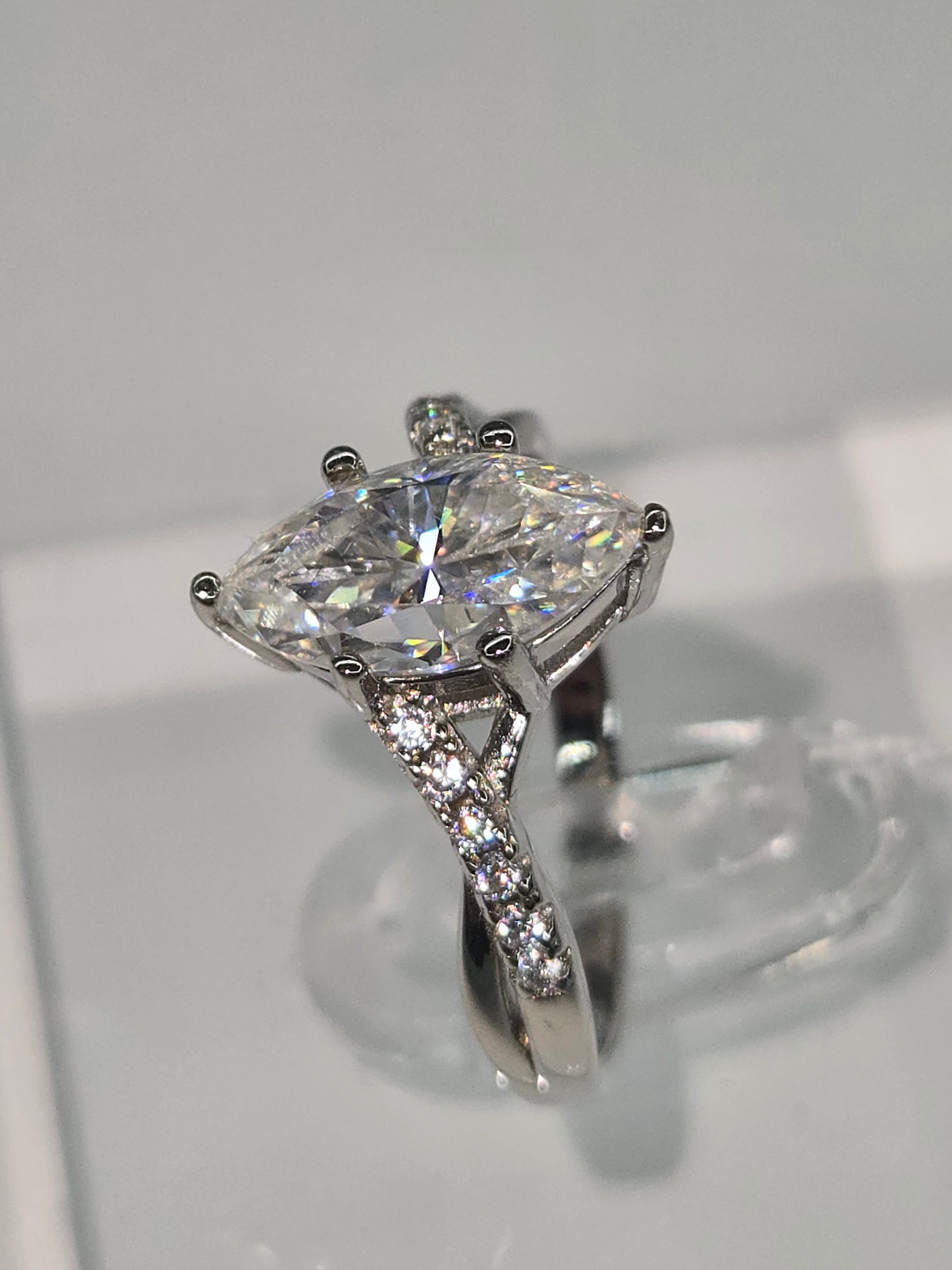 This exquisite infinite engagement ring features a 2-carat DVVS1 marquise-cut moissanite, renowned for its brilliance and clarity. Set on a sterling silver band with a delicate half-twist pavé design, it combines timeless elegance with modern sophistication. Perfect for symbolizing your enduring love with a touch of refined sparkle.