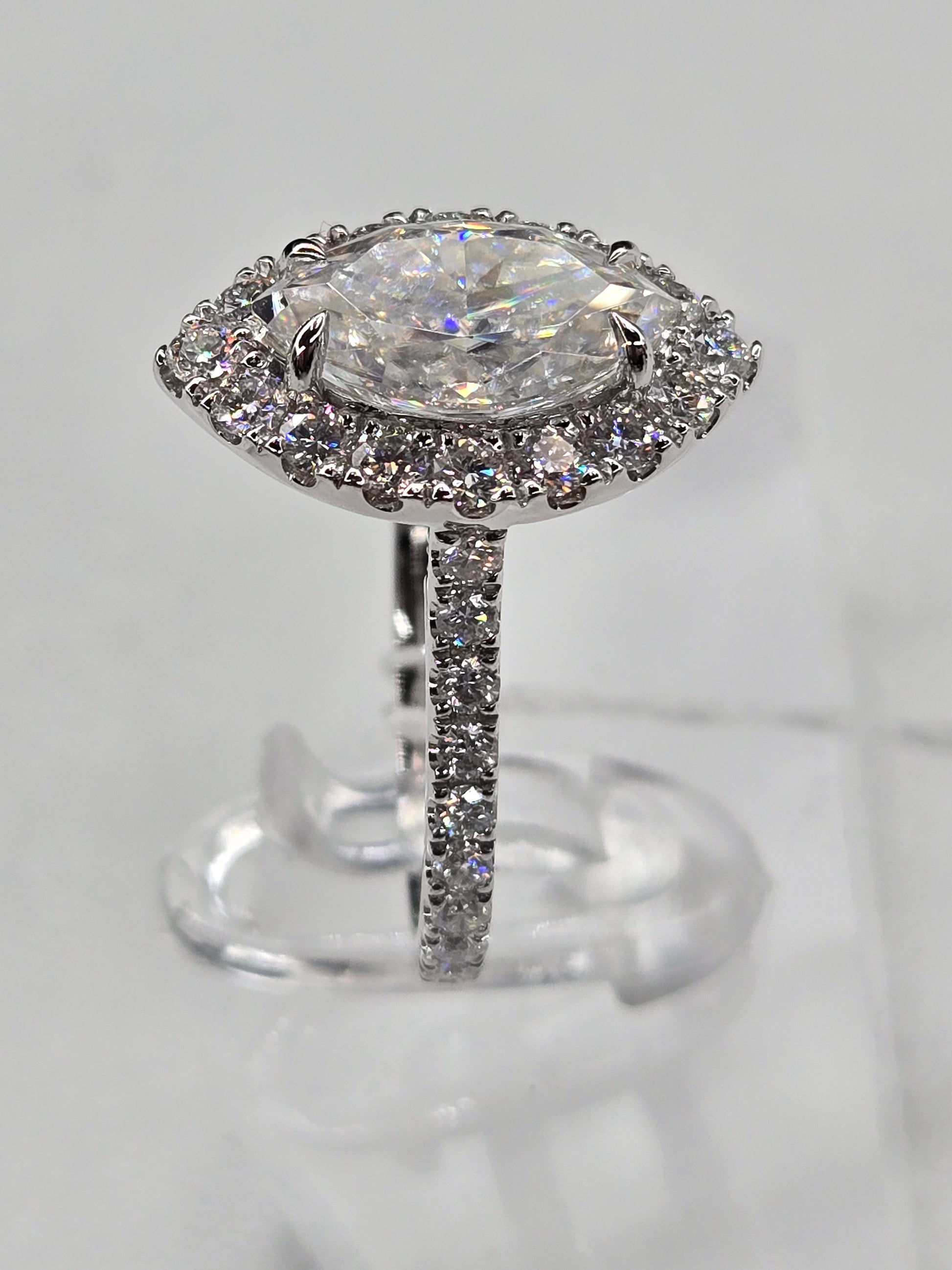 Crafted in 9k solid gold, this Marquise Engagement Ring features a stunning 2.5-carat DVVS1 moissanite center stone with a crushed ice cut, offering exceptional brilliance and clarity. The elegant halo and pavé band enhance its sophisticated design, making it a timeless symbol of love and commitment.