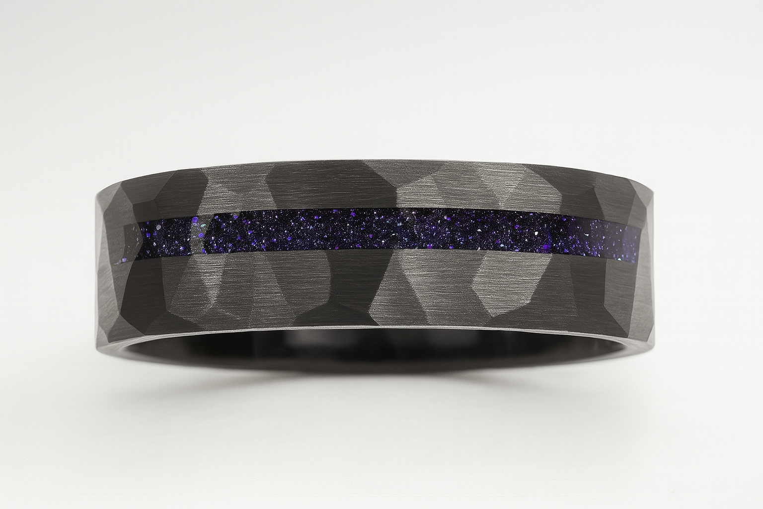 This 8mm men's band showcases a Matte Black hammered finish that adds a rugged texture, perfectly balanced by a striking Blue Sandstone inlay giving this ring a Galaxy effect. The combination creates a refined yet bold statement, ideal for those seeking a sophisticated and distinctive accessory.