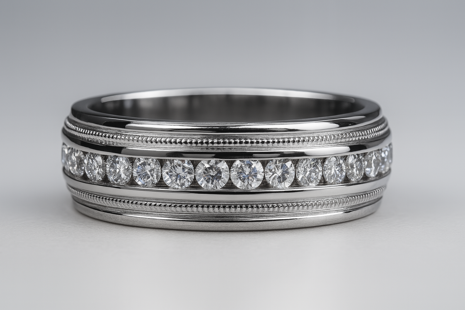 This 14k white gold men's band showcases a Half-Eternity design with a total of 1 carat of natural Diamonds, combining timeless elegance with a comfortable fit. Its refined craftsmanship makes it an ideal choice for those seeking understated luxury and lasting style.