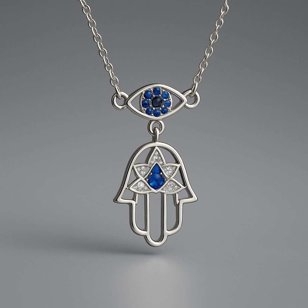 Elevate your style with the Hand of God & Evil Eye Pendant Necklace, crafted from 925 sterling silver and adorned with vibrant blue zircon stones. This adjustable necklace combines timeless symbolism with refined elegance, offering both protection and a striking accent to any outfit. Its delicate design and quality materials make it a sophisticated choice for everyday wear or special occasions.