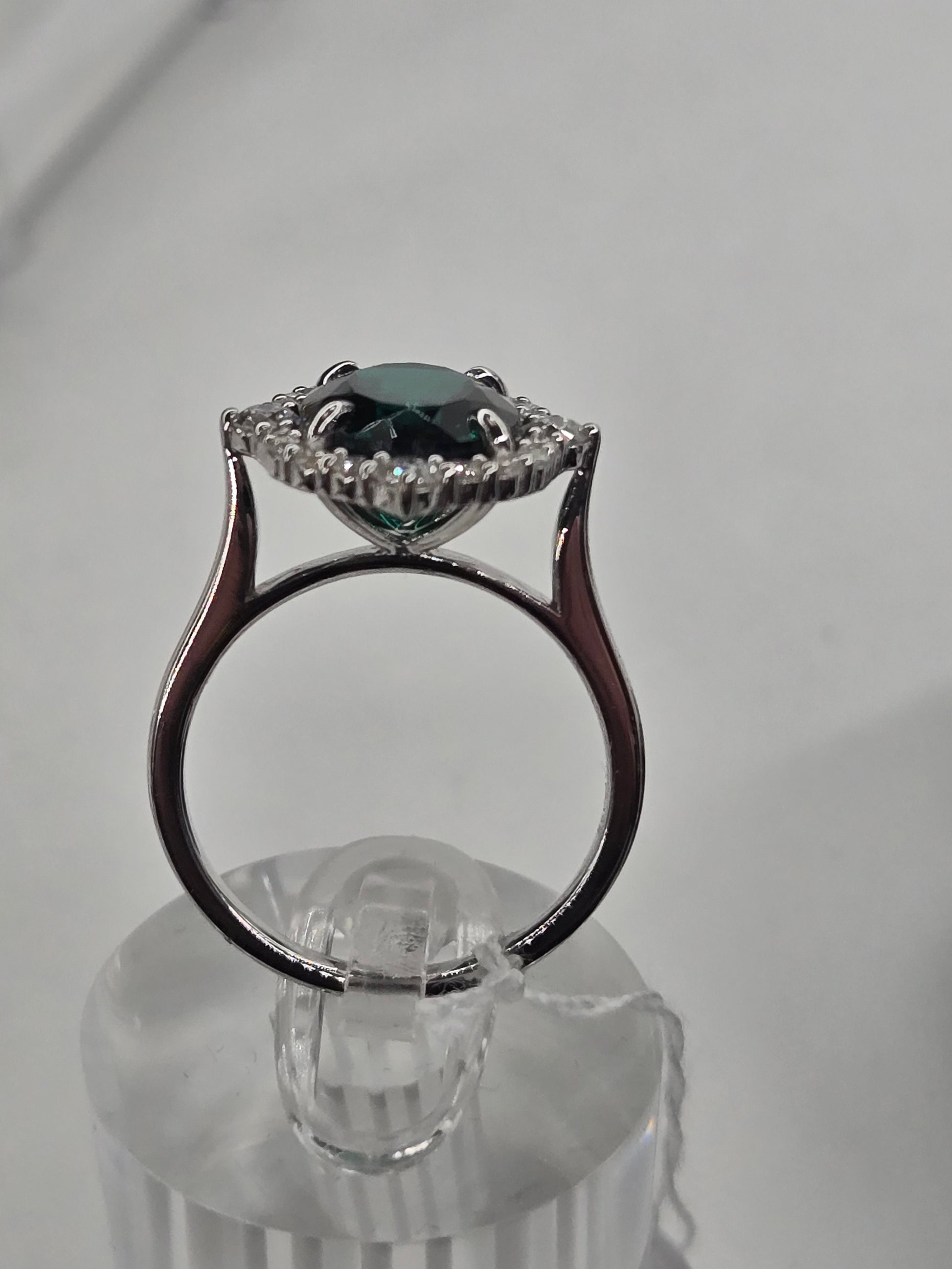 This exquisite engagement ring features a 4-carat oval-shaped lab-created emerald, elegantly framed by a sparkling zircon halo. Crafted with 18k white gold rhodium plating over sterling silver, it offers a brilliant shine and lasting durability. Perfect for those seeking a sophisticated and timeless symbol of love.