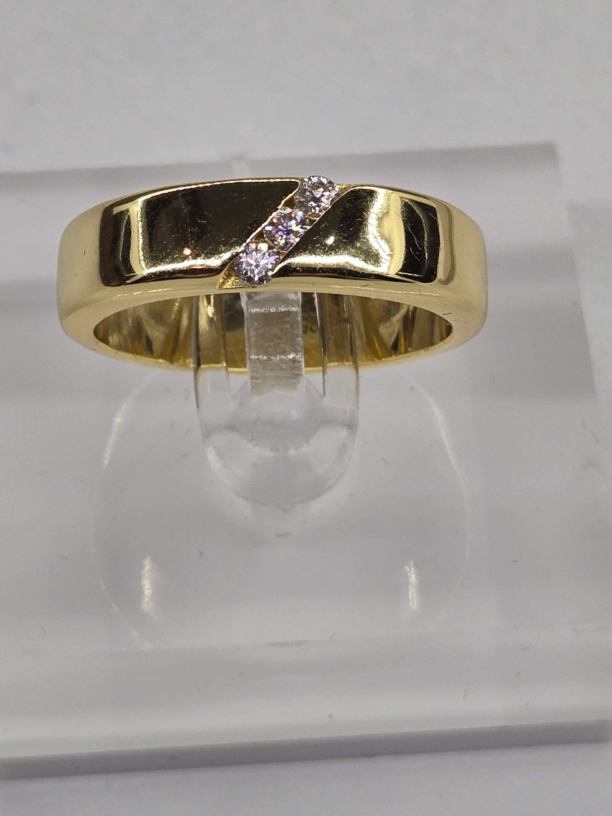 This elegant 4mm wedding band features a 14k gold dip finish, offering a refined and lasting shine. Adorned with three DVVS1 round moissanites, it delivers exceptional brilliance and clarity. Available in two stunning colors, this band combines timeless sophistication with versatile style, perfect for celebrating your special commitment.